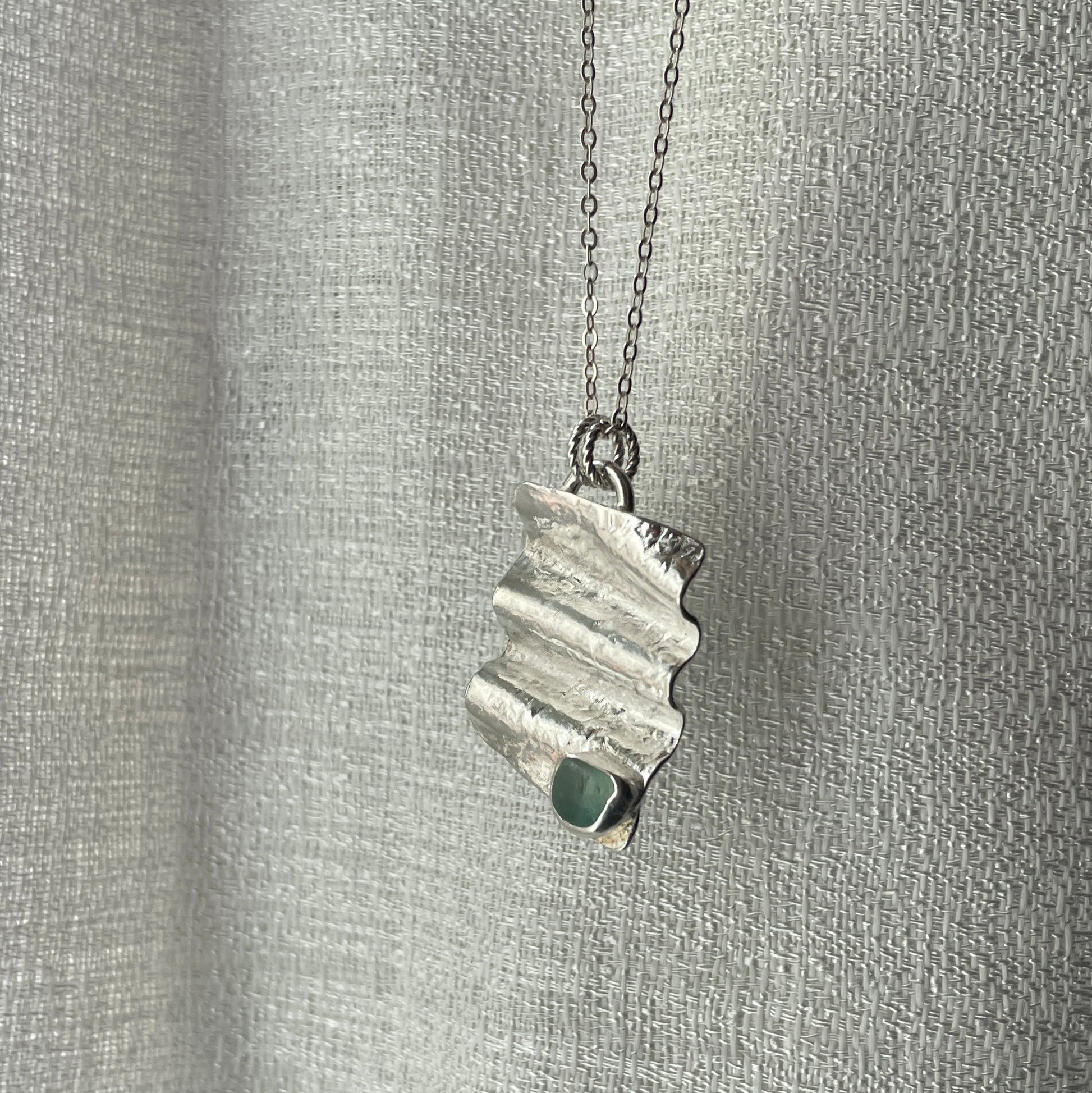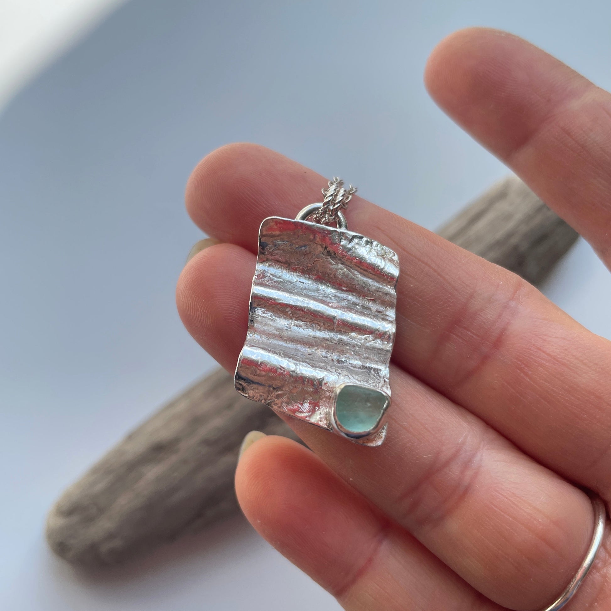 This wave on sandy beach sea glass necklace is handmade from 100% recycled 925 sterling Silver. the pendant was made with scrap silver with hammered texture, to create an eco friendly unique necklace, designed and handmade by me inspired by wave on sandy beach.