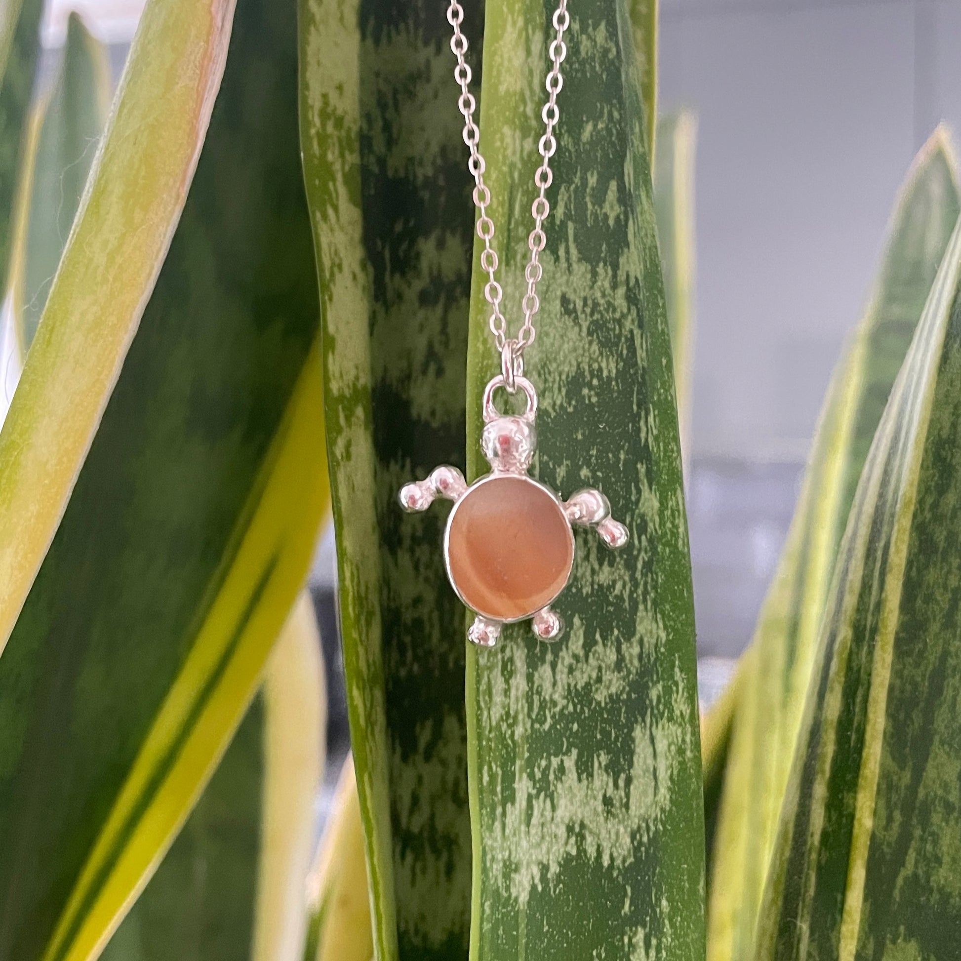 One of a kind multicolour sea glass turtle necklaces is handmade with 100% recycled 925 sterling silver.