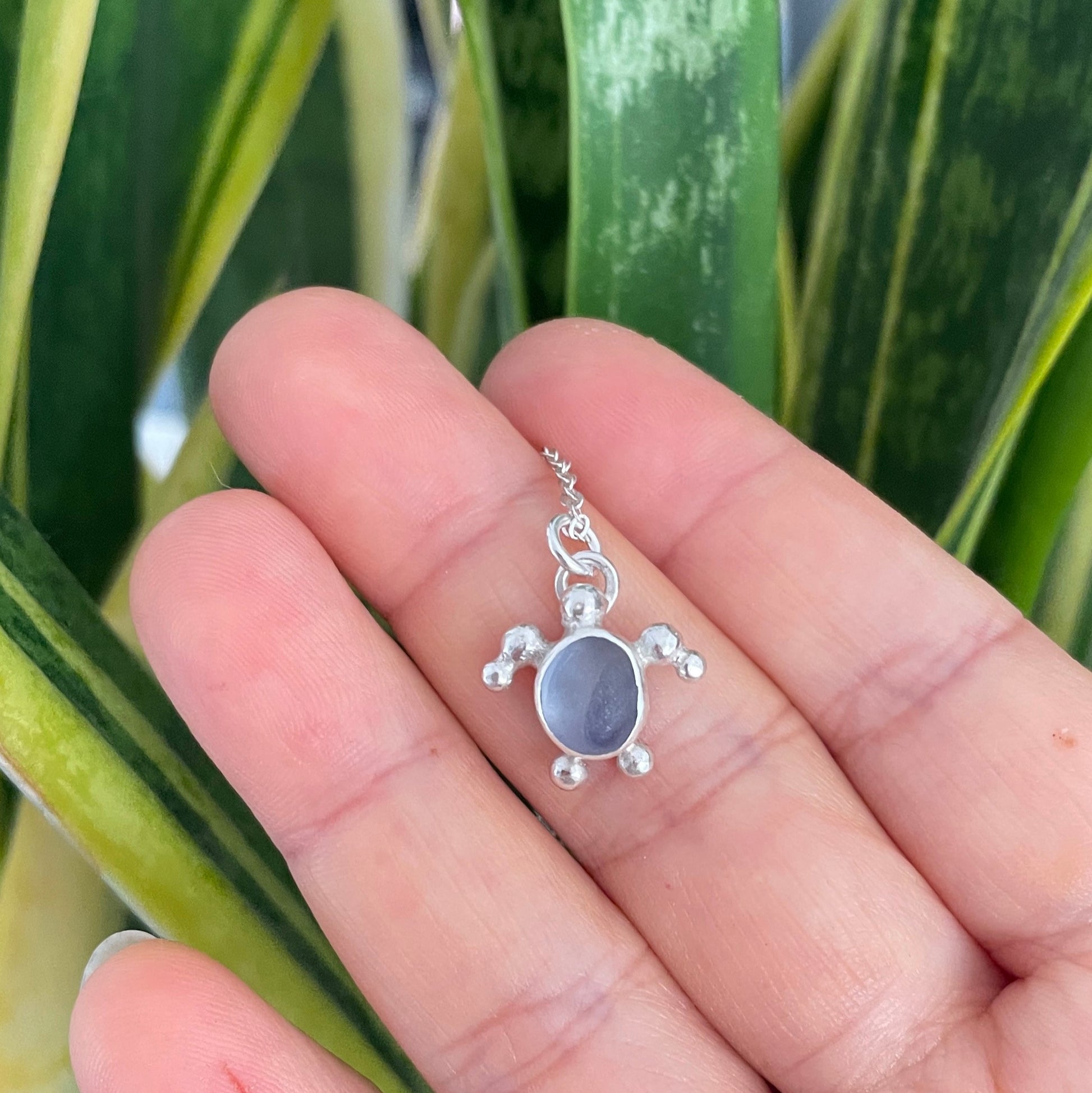 One of a kind purple sea glass turtle necklaces is handmade with 100% recycled 925 sterling silver.