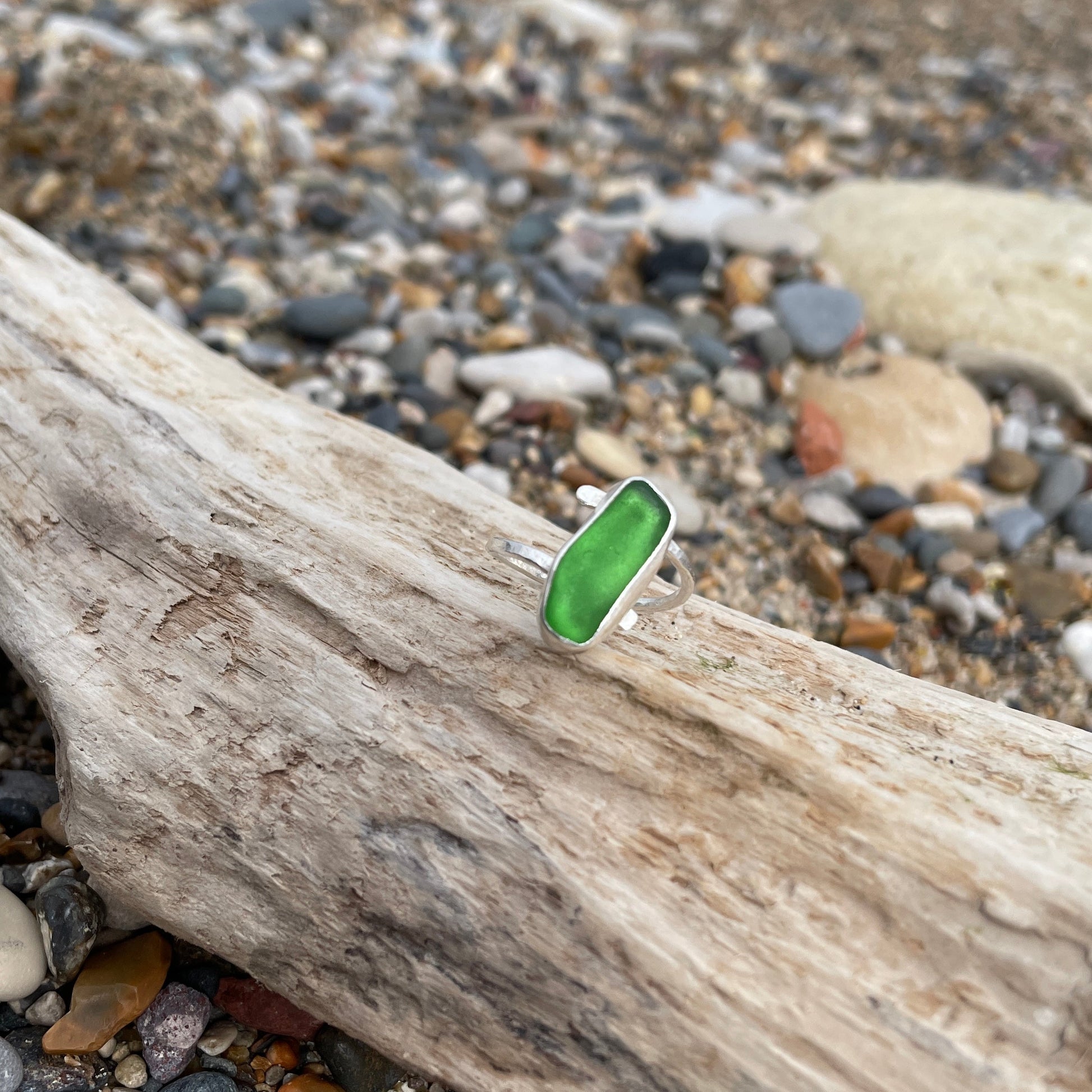 One-of-a-kind green colour sea glass ring handmade with 100% sterling silver, this beautiful green colour sea glass has been smoothing and shaping by ocean more than 100 years, it was carefully hand collected from beach in North east England.